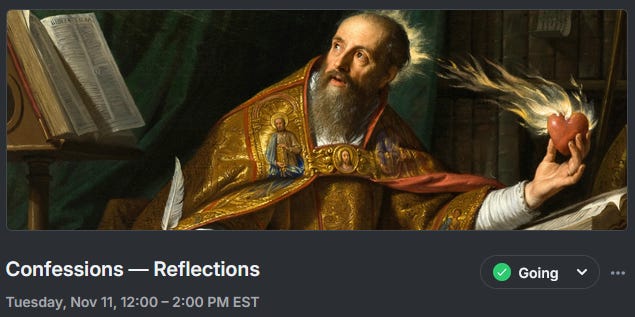 Our next discussion on Confessions by Saint Augustine is on November 11th at 12pm ET. Bring your thoughts, questions, and favorite passages!