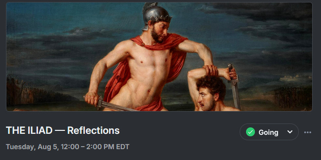 We’re diving back into The Iliad tomorrow, August 5th at 12 PM EDT — hope to see you there.