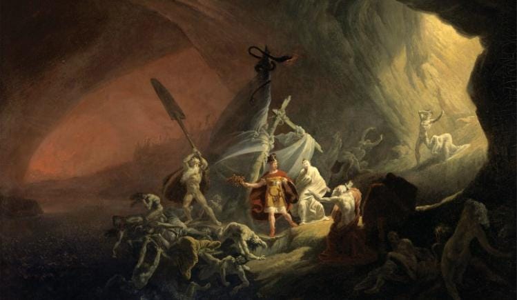 It echoes Aeneas’ descent into the underworld in Virgil’s Aeneid, Dante’s descent into Hell in the Inferno, and of course, Christ’s three days in Hell before his Resurrection.